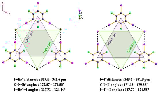Two different I∙∙∙Br− contacts and C-I∙∙∙Br− angles are present in both 3c and 3d, and the respective values are quite similar in the two structures. I2∙∙∙Br1 distances are 329.4(5) and 330.2(5) pm in 3c and 3d, respectively, while I1∙∙∙Br1 distances are slightly longer (341.6(3) and 343.8(4) pm). These values correspond to normalized contacts (Nc) that are quite small [33] (they are in the range 0.84–0.87), suggesting that XBs in these structures are fairly strong. This is even more notable [19,20] if we consider that the electron donor ability of the bromide and the electron acceptor ability of the iodofluorocarbon are split over three XBs. Consistent with this strength, the two different C-I∙∙∙Br angles present in 3c,d are almost linear (they span in a value range of 172.87(5)–179.88(5)°). The hexagonal motifs of the 2D honeycomb networks are slightly distorted due to the deviation of the I∙∙∙Br−∙∙∙I angles (they vary between 117.68(1)° and 124.62(1)°) from the ideal 120° for a symmetric trigonal coordination.