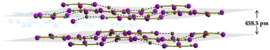 The cations’ nature affects the distance between two adjacent anionic layers as well; specifically, the larger the cation is, i.e., the more it protrudes out of the hexagons, the greater the interlayer separation becomes [34]. The distance between the two adjacent layers is 437.0(1) pm in 3c and is slightly greater in 3d (458.5(1) pm). This trend has also been observed between 3a and 3b (interlayer separations are 452.9 and 460.1 pm, respectively) and is probably due to the fact that a phosphonium cation is larger than the corresponding ammonium cation. The interlayer separations in 3c,d are smaller than the separation of the two supramolecular anionic nets in the co-crystal formed by the triiodobenzene derivative 1 with tetra-n-propylammonium iodide (554.9 pm), the largest tetraalkylammonium iodide that affords a honeycomb net upon self-assembly with 1.