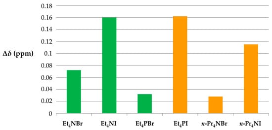 Finally, 19F NMR experiments were performed to assess the XB presence between 1 and 2c,d in solution (Figure 5). Small upfield shifts were observed for the signal of 1 upon the addition of different onium salts, with the chemical shift changes ranging from 0.028 to 0.162 ppm (Table S1). For a given cation, bromide salts afforded smaller chemical shift changes than iodide salts in all cases, consistent with observations reported for other haloperfluorocarbons/halide adducts in solution [35].