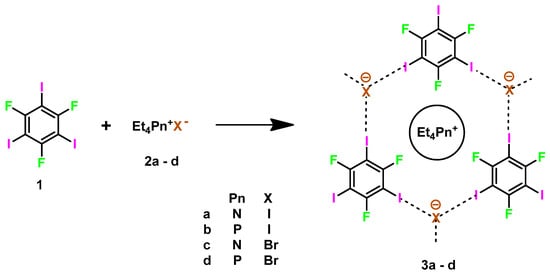 In general, different halides can assemble different structures under control of electrostatic interactions, metal coordination, and HB [39], and the same holds when XB is the driving force of the self-assembly processes [40,41]. Different halides can present different coordination spheres, and bromide for iodide substitution in heteromeric multicomponent systems (3) is expected to give rise to XBs and electrostatic attraction between opposite ions (the two strongest interactions in co-crystals 3a–d) endowed with strengths that are quite different [42]. The triiodobenzene derivative 1 can work as a mono-, bi-, or tritopic XB donor [43], and bromide anions frequently function as di-, tri-, or tetratopic acceptors [44], but such anions can also present other XBs in their first coordination sphere, as they have been reported to act even as octatopic acceptors [45]. In the systems described here, the tetraethyl onium cations enable the assembly of three units of 1 around a bromide anion and combined matching, both at steric and electronic levels, of all the components of 3a–d allows 1 to work as a planar and trigonal tecton in the XB driven self-assembly of supramolecular halide networks. This behavior recalls the HB driven self-assembly processes wherein trimesic acid or 1,3,5-triazine derivatives function as planar and threefold tectons.