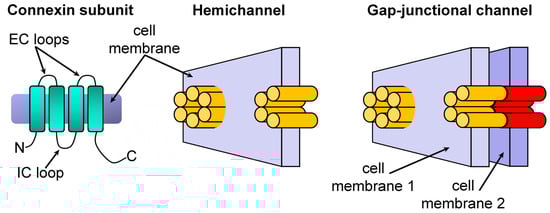 Connexins, gap-junction channels, and hemichannels. Schematic representation of a connexin subunit (monomer), an hemichannel (HC) formed by six connexins, and a gap-junctional channel (GJC) formed by two HCs docked head to head. The cyan rounded rectangles in the connexin denote transmembrane helices. EC: extracellular; IC: intracellular. In the HCs and GJC each subunit is illustrated as a cylinder. Adapted from reference []; reproduced with permission from the American Society for Biochemistry and Molecular Biology.