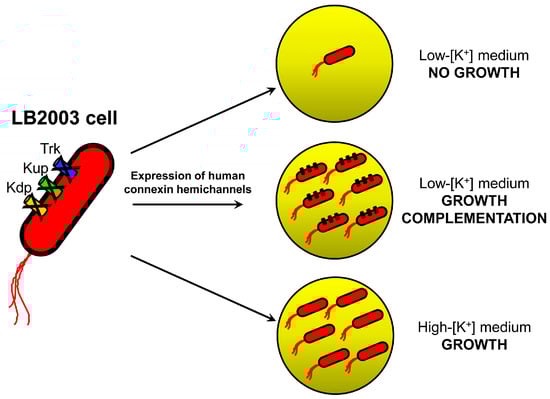 Recently, we found that human connexin 26 (Cx26) and connexin 43 (Cx43) HCs can be functionally expressed in Escherichia coli, and we developed a growth-complementation assay to assess HC function using LB2003 as host [,]. LB2003 E. coli cells are missing three K+ uptake systems and cannot grow in low-[K+] medium [,,]. However, their inability to grow in low-[K+] medium can be rescued by expression of recombinant K+-selective channels or connexin HCs (Figure 2) [,,,]. Expression of the “large” poorly selective HCs results in increased K+ permeability and influx, which allows growth in low-[K+] media; K+ is required for maintenance of turgor pressure, enzyme activation, intracellular pH regulation, etc.