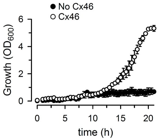 Hemichannels formed by Cx26, Cx43, and Cx46 are present in a variety of tissues and organs. Cx26 is associated with the physiology and pathophysiology of the inner ear, Cx43 with that of heart, brain, and kidneys, and Cx46 with that of the lens [,,,,]. We have previously determined the best conditions for the growth complementation assay associated with the expression of Cx26 and Cx43 []. Based on our experience with these connexins, the most important tasks for the optimization of the assay are to increase reproducibility and the signal-to-noise ratio. The first task is accomplished through the use of defined media. We use Na+ liquid medium (NLM) and K+ liquid medium (KLM). NLM is a K+-free phosphate-buffered medium (see Materials and Methods), whereas KLM is a K+-rich medium that has the composition of NLM, except for the equimolar replacement of Na+ with K+. LB2003 cells do not grow in NLM, but grow in KLM []. By mixing NLM and KLM it is easy to find a range of low [K+]s where LB2003 cells expressing connexins grow. To optimize the signal-to-noise ratio we identified the “low” [K+] at which the connexin-expressing cells grow to the highest absorbance measured at 600 nm (OD600), and then tested the dependence of the growth on the concentration of the expression inducer, isopropyl-β-d-thiogalactopyranoside (IPTG). This is important because the optimal signal-to-noise ratio depends on a balance between sufficient permeability to allow K+ uptake through HCs and too many active HCs, which inhibits growth as a result of depolarization of the inner membrane and/or unbalanced shifts of ions and metabolites. In the case of Cx26, optimal growth is achieved with 4 mM K+ and 500 μM IPTG, but for Cx43, 8 mM K+ and 10 μM IPTG work best. From initial trials, we identified 16 mM K+ and 10 μM IPTG as the best conditions for the Cx46 growth complementation assay. Figure 3 illustrates the time dependence of the growth of LB2003 cells expressing Cx46 and shows that human Cx46 can complement the growth of LB2003 cells in low-[K+] medium, as Cx26 and Cx43 do.