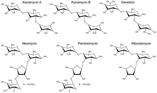 - Wang, J.; Chang, C.-W.T. Design, chemical synthesis, and antibacterial activity of kanamycin and neomycin class aminoglycoside antibiotics. In Aminoglycoside Antibiotics: From Chemical Biology to Drug Discovery; Arya, D.P., Ed.; John Wiley & Sons, Inc.: Hoboken, NJ, USA, 2007; pp. 141–180. [Google Scholar]