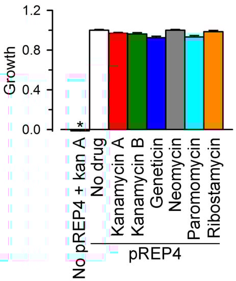 Absence of aminoglycoside (AG) antibiotic effect in LB2003 cells transformed with the pREP4 plasmid. All drugs were used at a concentration of 100 μM. The cells were grown in K+ liquid medium (KLM). The pREP4 plasmid carries the neomycin phosphotransferase gene. No pREP4 + kan A: effect of kanamycin A in AG-sensitive cells; all other bars correspond to AG-resistant cells containing the pREP4 plasmid, in the absence (no drug) or presence of the indicated AGs. Data were normalized to the OD600 of LB2003-pREP4 cells in the absence of drug (5.7 ± 0.1). Data are means ± SEM of three independent experiments (in triplicate) per condition. * denotes a p < 0.001 vs. all other groups.