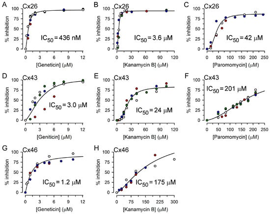 Inhibition of connexin-dependent growth complementation by kanamycin B, geneticin and paromomycin. (A–C) Effects on Cx26-dependent complementation. (D–F) Effects on Cx43-dependent complementation. (G,H) Effects on Cx46-dependent complementation. Each symbol denotes the average of a triplicate measurement, and each color corresponds to an independent experiment. The lines represent fits of Hill’s equation to the data. In all cases, growth inhibition was significant, with a p of at least 0.01 vs. growth in the absence of drug.
