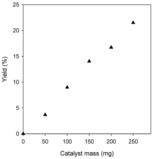 To optimize the amount of catalyst, the Pechmann condensation between phenol and ethyl acetoacetate was carried out under solvent-free conditions over Amberlyst-15 catalyst for 20 min at 100 °C using a molar ratio of phenol: Ethyl acetoacetate of 1:1. As can be observed, the conversion of phenol gradually increased from 3.8% to 21.5% with increasing the amount of catalyst from 0.050 to 0.250 g (Figure 1). Subsequently, the effect of the temperature in the reaction was also studied. When the reaction was conducted at 130 °C, a total conversion of phenol around 43% was obtained, which is twice the conversion reached at 100 °C (see Figure 1, 21.5%). A further increase of the temperature at 160 °C gave a conversion of 54%. However, it was accompanied with a lower selectivity, giving rise to the formation of a high number of byproducts. Accordingly, for further experiments, the reaction temperature was set up at 130 °C.