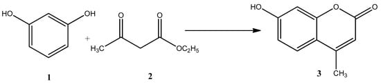 Pechmann reaction of resorcinol (1) with ethyl acetoacetate (2) to produce 7-hydroxy-4-methylcoumarin (3).