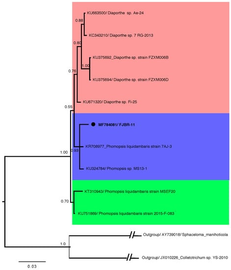 Phylogenetic relationship of isolate FJBR-11 (accession no. MF784081) to representative sequences of known Phomopsis sp. and Diaporthe sp. Reference sequences were retrieved from GenBank and a Sphaceloma sp. and a Colletotrichum sp. served as an outgroup. The isolate FJBR-11 from the current study is marked with a black dot. The distance unit is substitutions/site.
