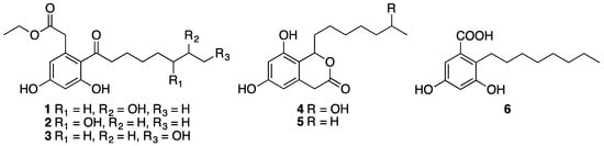 White powder; 1H-NMR (500 MHz, CD3OD) δ 6.23 (1H, d, J = 2.3 Hz, H-6), 6.14 (1H, d, J = 2.2 Hz, H-4), 5.61 (1H, dd, J = 8.6, 5.2 Hz, H-9), 3.79 (1H, d, J = 19.6 Hz, H-2a), 3.48 (1H, d, J = 19.6 Hz, H-2b), 1.90–1.74 (2H, m, H-10), 1.53 (1H, m, H-11a), 1.43 (1H, m, H-11b), 1.40–1.24 (8H, m, H-12, H-13, H-14, and H-15), 0.90 (3H, t, J = 6.9 Hz, H3-16). 13C-NMR (125 MHz, CD3OD) δ 174.1 (C-1), 159.5 (C-5), 155.2 (C-7), 132.8 (C-3), 113.9 (C-8), 106.0 (C-4), 102.0 (C-6), 80.1 (C-9), 36.7 (C-10), 35.5 (C-2), 32.9 (C-14), 30.3 (C-13), 30.2 (C-12), 26.6 (C-11), 23.7 (C-15), 14.4 (C-16).