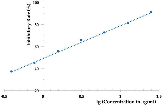 Growing leaves of N. tabacum cv. K326 were mechanically inoculated with TMV (30 μg/mL in 0.01 M PBS). After 6 h, leaf discs (1 cm diameter) were punched and floated on solutions for testing. Discs of healthy and inoculated leaves floated on a solution of 0.01 M PBS with 2% DMSO were used as mock and negative controls, respectively. Three replicates were carried out for each sample. After incubating for 48 h at 25 °C in a culture chamber, the leaf discs were ground in 0.01 M carbonate coating buffer (pH 9.6) and OD405 values were measured using the TAS-ELISA method. TAS-ELISA was performed as described in the literature [,]. Virus concentration was calculated from a standard curve constructed using OD405 values of purified TMV at concentrations of 1.0, 0.5, 0.25, 0.125, and 0.0625 μg/mL. The inhibition of test solutions on TMV was calculated as follows: Inhibition rate = (1 − (virus concentration of treatment)/(virus concentration of negative control)) × 100%.