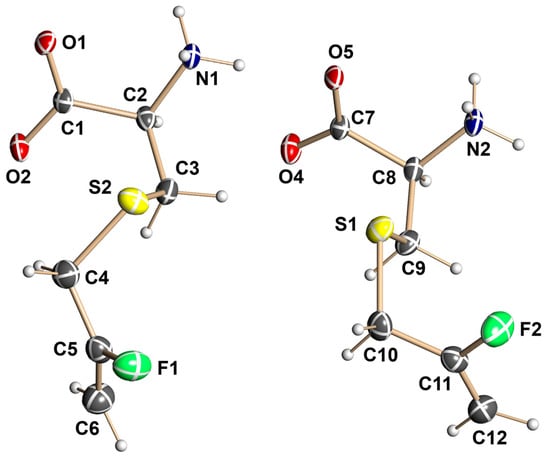 Treatment of 9 with cysteine in NH4OH afforded fluorodeoxyalliin (13; S-2-fluoro-2-propenyl-l-cysteine) in 73% yield. After crystallization 13 could be characterized by X-ray crystallography as the pure enantiomer shown in Figure 1. Structural data is given in Table 1. Two molecules co-crystallized in the structure; they are just slightly different in bond dimensions. Oxidation of an aqueous solution of 13 (30% H2O2) gave fluoroalliin (22; S-2-fluoro-2-propenyl-l-cysteine S-oxide; 82% yield). When 22 was treated with powdered fresh garlic, the presence of small amounts of 12 and isomers of mono-fluoroallicin 23 along with major amounts of allicin 4 was suggested by DART-MS analysis; the presence of 12 and 23 was also consistent with the results from 19F-NMR spectroscopy.