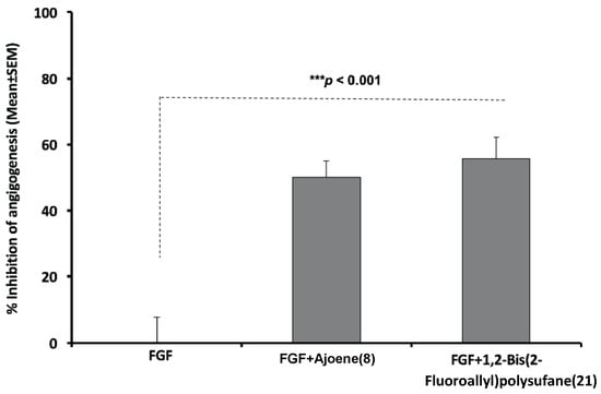 Anti-angiogenesis efficacy of ajoene compared with 1,2-bis(2-fluoroallyl)polysulfane mixture (21) against FGF-mediated angiogenesis in the CAM [***p < 0.001] by 4 μg/20 μL/CAM of ajoene (8) or 1,2-bis(2-fluoroallyl)polysulfane (21). Data showed significant (***p < 0.001) and comparable anti-angiogenesis efficacy between ajoene (8) and 1,2-bis (2-fluoroallyl) polysulfane (21). Data represent Mean (% inhibition of angiogenesis) ± SEM, n = 8 CAM/group.