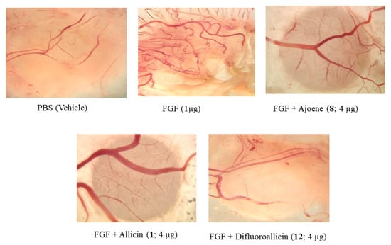 Representative images of CAM neovascularization induced by FGF (bFGF) and its inhibition by the various garlic-derived compounds, including ajoene (8), allicin (1) and difluoroallicin (12) each at 4 µg/20 µL/CAM. The images shown are representative single images selected for illustration of the general anti-angiogenesis efficacy of the organosulfur compounds and not for quantitative purposes.