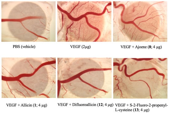 Representative images of CAM neovascularization induced by VEGF and inhibited by garlic-derived compounds, including ajoene (8), allicin (1), difluoroalliicin 12, and S-2-fluoro-2-propenyl-l-cysteine (13), each at 4 μg/20 μL/CAM. The images shown are representative single images selected for illustration of the general anti-angiogenesis efficacy of the organosulfur compounds and not for quantitative purposes.