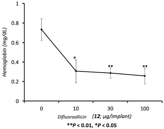 Dose-response inhibition of FGF-induced angiogenesis (hemoglobin, mg/dL) in FGF enriched Matrigel® with or without different doses ranging from 1–100 μg of difluoroalliicin (12) in mice. Data represent Mean Angiogenesis index (Hemoglobin, mg/dL) ± SEM, n = 18 Matrigel® implant/group.