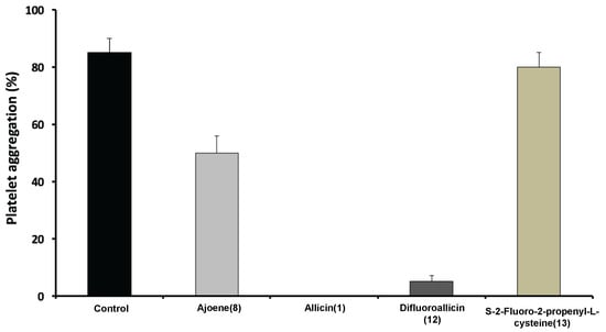 Antithrombotic drugs are classified as either anticoagulants or antiplatelet drugs. Anticoagulants slow down clotting, thereby reducing fibrin formation and preventing clots from forming and growing, while antiplatelet agents prevent platelets from aggregating (clumping), also preventing clots from forming and growing. The effect of various organosulfur compounds on platelet aggregation was assessed using human whole blood impedance aggregometry-induced by collagen. Allicin (1; 62 μM) and difluoroallicin 12 (51 μM) demonstrated the most potent inhibition of platelet aggregation (p < 0.001) as compared to ajoene or S-2-fluoro-2-propenyl-l-cysteine (13) (Figure 8). At these concentrations, allicin was slightly more effective compared to difluoroallicin.