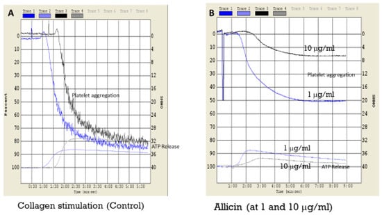 Representative platelet aggregation and ATP secretion in response to collagen (A) and collagen plus allicin at 1 and 10 μg/mL (B). The representative illustration showed inhibition of both platelet aggregation and ATP secretion versus control (collagen).