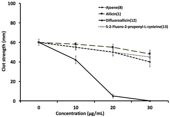 Effect of various garlic-derived compounds including ajoene (8), allicin (1), difluoroalliicin (12), and S-2-fluoro-2-propenyl-l-cysteine (13) on clot strength in human blood using thrombelastography at different amount. Data represent mean clot strength (MA, mm) ± standard deviation, n = 4.