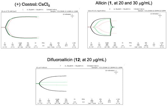 Representative tracing of clot kinetic for control human blood and blood treated with either allicin (1) or difluoroalliicin 12 at 20–30 μg. The clot strength is measured by the width of the tracing at the end of tracing. For the positive control, there is a large width seen, which means that effective blood coagulation occurred. Difluoroallicin 12 showed distinct and greater inhibition at 20 μg/mL concentrations compared to allicin. This can be seen in the green trace relative to the control black tracing.
