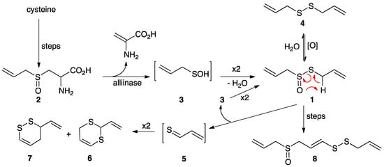 Enzymatic formation of allicin (1) from alliin (2) by way of 2-propenesulfenic acid (3), synthesis of allicin by oxidation of diallyl disulfide (4), conversion of 1 to ajoene (8), and decomposition of 1 to vinyl dithiins (6 and 7) via intramolecular elimination to thioacrolein (5).