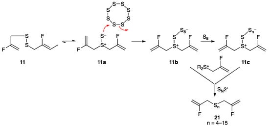 Conversion of disulfide 11 to polysulfane mixture 21 through condensation with molten sulfur. Several equivalents of S8 can react, losing different numbers of sulfur atom groupings, followed by SN2′ reaction with 2-fluoroallyl sulfonium species giving polysulfane mixture 21.