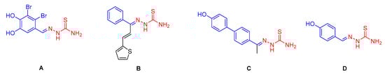The structure of the benzaldehyde thiosemicarbazide derivatives. (A) Anticancer activity; (B) antifungal activity; (C,D) tyrosinase inhibitor.