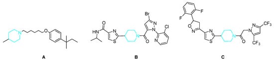 Heterocyclic compounds have received considerable attention in recent years owing to their broad bioactivities and have become of significant importance in industry and biology []. As a saturated heterocyclic, piperidine is a cyclic secondary amine that has been frequently reported for its multiple activities, such as anti-HIV [], histamine H3R ligands (Figure 2A) [], antimalarial [], antimicrobial [], antifungal (Figure 2B) [], anticoagulant [], and other biological properties []. For instance, oxathiapiprolin (Figure 2C), the first member of the piperidinyl thiazole isoxazoline fungicides developed globally as DuPont™ Zorvec™, can control plant diseases caused by oomycete pathogens in different stages of the pathogen’s life cycle at extremely low concentrations [].
