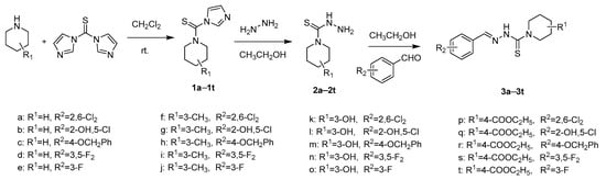 The title compounds 3a–3t were prepared from intermediate 2 followed by a condensation reaction with substituted benzaldehyde in ethanol as the solvent (Scheme 2).