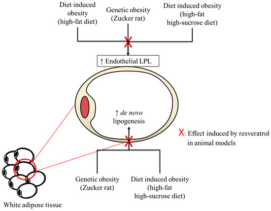 Obese Zucker rat show several alterations in white adipose tissue triacylglycerol metabolism. These included increased activity of lipoprotein lipase (LPL), the enzyme that hydrolyses triacylglycerols circulating as chylomicrons, and very low density lipoproteins (VLDL) into free fatty acids, and increased lipogenic enzyme activity, involved in de novo lipogenesis, the metabolic process that allows adipose tissue to synthesize fatty acids from acetyl-CoA. These metabolic alterations, among others, lead to increased body fat accumulation from a very early age in these particular rats [38,57]. With regard to animals that were fed a high-fat diet, it has been reported that this dietary pattern leads to increased LPL activity in the long term [58]. In the case of high-fat high-sucrose diets, both (increased LPL activity and de novo lipogenesis) are observed [59]. As a result, in both cases, increased availability of free fatty acids in adipose tissue leads to their enhanced storage as triglycerides. When resveratrol is administered to the animals, it is able to inhibit LPL [33,37,60] and lipogenic enzymes [18,19,22,33,60], thus counteracting, at least in part, the metabolic alterations that lead to increased fat accretion in both genetic and dietary-induced obesity models. Consequently, resveratrol acts in preventing obesity development.