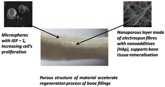 A new technology for producing porous, multilayer, fibre-based bone implants from PLGA and PHB was developed. To obtain increased osteostimulation, implants were supplemented with nanoparticles with HAp and microspheres containing IGF1. The assumption made when using such materials was that the nanoparticles containing HAp should accelerate the process of bone remineralisation, whereas the presence of IGF1 should influence the process of cell proliferation and cause faster rebuilding of the destroyed tissue. The presented multi-layered construction of the material consisted of two different types of nonwoven materials to ensure better behaviour in the tissue regeneration. A needle-punched layer, built by open pores with a diameter of approximately 150 μm contains characteristics typical for osteoinductive structures, where cells can easily grow inside the structure [2]. At the same time, the nanofibrous layer creates a good surface for cell immobilization, as well as, thanks to the incorporation of the HAp, better activation of the remineralisation process. This layer is also a barrier for microspheres incorporated into the structure of the material. In the future, the nanoporous layer can be replaced by another type of material, like a microporous membrane or foam. The application of the IGF1 peptide caused the process of sterilisation of the material to be realized in two steps to avoid the risk of peptide denaturation.