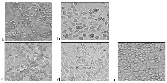 L929 cell cultures obtained during the cytotoxicity test of the indirect method (nonpolar extract) after 72 h of incubation. (a) Cells incubated with PLGA extract; (b) Cells incubated with PLGA + IGF1 extract; (c) Cells incubated with PLGA/PHB extract; (d) Cells incubated with PLGA/PHB + IGF1 extract; (e) L-929 culture without contact with extract from tested materials.