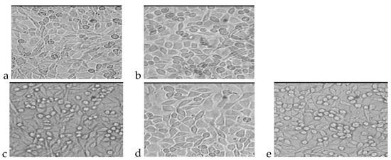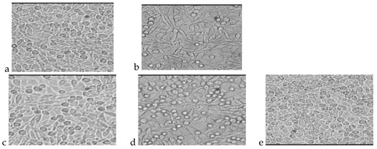 L929 cell cultures obtained during the cytotoxicity test of the indirect method (polar extract) after 72 h of incubation. (a) Cells incubated with PLGA extract; (b) Cells incubated with PLGA + IGF1 extract; (c) Cells incubated with PLGA/PHB extract; (d) Cells incubated with PLGA/PHB + IGF1 extract; (e) L-929 culture without contact with extract from tested materials.