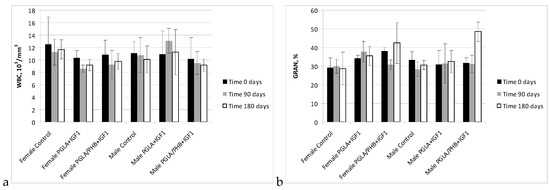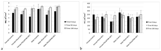 The haematology blood of rabbits (male and female) with implanted samples of bone implants made from PLGA copolymer and its mixture with 10% of PHB (PLGA/PHB), with both materials containing insulin-like grow factor IGF1, has shown that the materials do not cause significant changes in the values of red, white blood cell and platelet parameter. The values of these parameters were comparable to the control group. The average values ± standard deviations are given in the form of Figure 5, Figure 6, Figure 7 and Figure 8. Haematological tests of rabbit blood (females and males) with implanted specimens of PLGA + PHB and PLGA implants showed that they did not cause significant changes in the parameters of haematological parameters. The values of these parameters were comparable to the control group values.