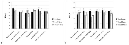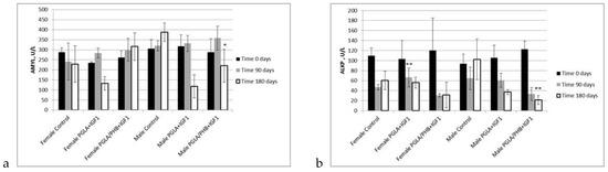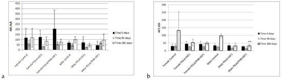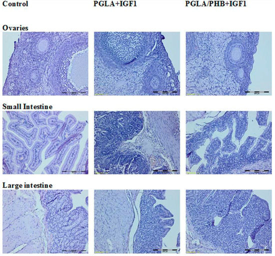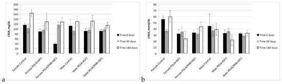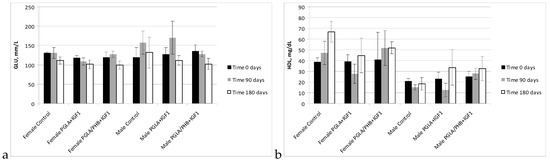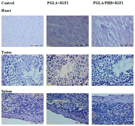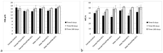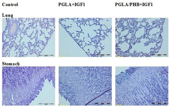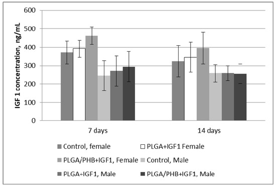 Diagnostic evaluation parameters included blood haematology, biochemistry, and coagulation for males and females in the control group and experimental groups with the bone implants PLGA/PHB + IGF1 and PLGA + IGF1. The implants tested in groups of animals do not substantially affect the value of these parameters compared to those of the control groups [36]. The obtained results for the experimental groups are comparable to those of the control group and are within the scope of their reference values. The observed slight changes in values indicate the on-going process of resorption of implants’ fibres in the tissue. The tests of the IGF1 concentration in blood plasma after the implantation of materials containing microspheres with this peptide do not show important changes to the amount of IGF1 in the blood compare to the control. The concentration of IGF1 in the blood of female and male rabbits was comparable in both groups of animals. Tests of blood parameters have diagnostic significance because they allow assessment of the functioning of the internal organs.