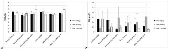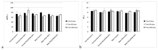 In studies of the coagulation time of activated partial thromboplastin time, prothrombin time, thrombin time, and fibrinogen time in the treated groups (males and females) for PLGA + IGF1 and PLGA/PHB + IGF1 were in the range of the control group. The average values ± standard deviations are given in the form of Figure 9 and Figure 10. In the coagulation tests, partial thromboplastin time after activation, prothrombin time and thrombin time and fibrinogen concentration for the test groups (females and males) in PLGA and PLGA + PHB were within the range of the control group.