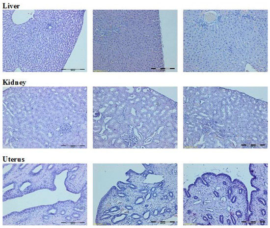 The autopsy of the animals, for both the control group and experimental groups did not show any skin, bone or muscle changes. The natural orifices (outer ear, eyes, nostrils, mouth, and anus) and external genital organs showed no lesions. In the peritoneum and chest, all the organs were arranged properly, with preserved anatomical shape, colour and size. None of the inspected treated organs sowed macroscopic lesions in the macroscopic or microscopic studies of internal organs: kidneys, lungs, heart, liver, small intestine, colon, and uterus, ovaries and testes of animals from experimental groups—females and males showed no difference from those of the control group. The internal organs in both groups showed no signs of a pathological condition.