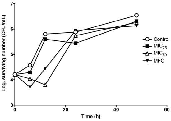 The essential oil has a fungistatic effect on the survival curve of C. albicans. It should be noted that in the case of azoles 20% yeast growth is allowed during the 48-h incubation []. It is important to observe that after 12 h of treatment the concentration of MIC50 showed a decrease in the fungi population. Nevertheless, the increase of the fungi population with the FMC at 24 h was observed, this is probably due to trailing growth that is observed in the Candida species []. It is necessary to emphasize that the use of antifungals has been registered from the 1950s []. Since this time the development of antifungals against C. albicans always has been a priority for the scientific community. However, the prolonged management of candidiasis using antifungals might cause the development of drug-resistant candidiasis [,,]. An alternative has involved the search for new treatments in medicinal plants.