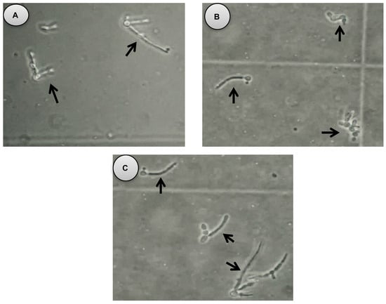 Germ tube growth after two hours of activation with fetal bovine serum with addition of (A) Control without essential oil; (B) Essential oil at a concentration of 8.0 mg/mL, which resulted in a decreased ability of the yeast to develop a germ tube; (C) Essential oil at a concentration of 0.5 mg/mL, with many yeast having normal germ tube growth, but some having poor growth. Arrows indicate the germ tube growth. Microphotographs were taken at 40×.