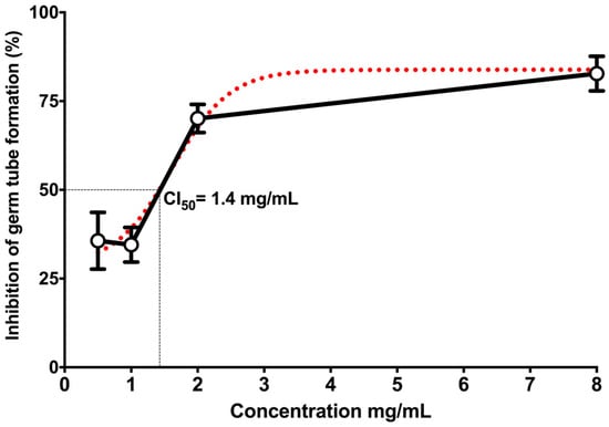 Effect of essential oil from B. morelensis concentration on germ tube growth of C. albicans 14065. Black line: experimental data; red dotted line: predicted values.