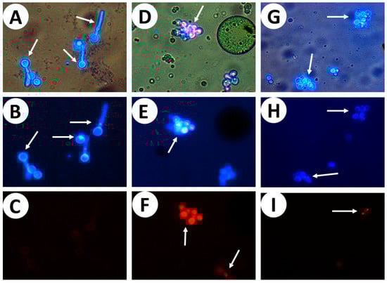 Microphotographs (40×) obtained in fluorescence microscopy and dyed with Calcofluor-white stain ((B,E,H), λ = 360 nm) and propidium iodide ((C,F,I), λ = 536 nm). Visible light (A,D,G). (A–C) shows the control, while (D–F) are the yeasts exposed to essential oil (10 mg/mL) for 2 h. (G–I) show the yeasts exposed to essential oil (2 mg/mL) for 2 h.