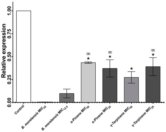 qRT-PCR of the expression of INT1 gene of C. albicans exposed to different concentrations of essential oil of B. morelensis, α-Pinene and γ-Terpinene. * Significant differences exist regarding the group of B. morelensis MIC25 (p < 0.05). ∞ Significant differences exist regarding the group of B. morelensis MIC12.5 (p < 0.05).