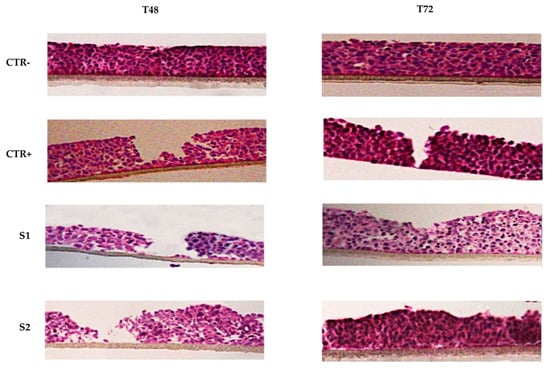 Histological analysis (HE staining) is a useful tool to study epithelial integrity and repair phenomena that follow the induction of mechanical damage. The histological images shown in Figure 1 present the overtime wound closure of the different samples. The negative control CTR− had an intact and correct structure for the entire period of exposure. After wound, it is possible to appreciate a recovery of the damage overtime in the positive control CTR+ samples at 48 h and 72 h. The epitheliums treated with the two solutions S1 and S2 exhibited a clear improvement in the wound closure respect to the positive control.