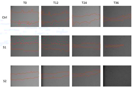 In vitro wound healing assay of human corneal epithelial cells. After the scratch, HCEpiC cells were incubated in fresh medium with or without S1 and S2 for 36 h. Representative images from each group were recorded at 0, 12, 24 and 36 h post-scratching. The red lines indicate the wound borders.