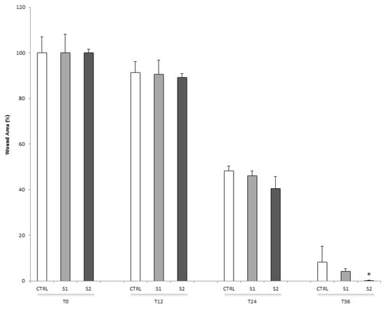 To confirm the wound healing properties of S1 and S2, HCEpiC cells were subjected to wound healing assay performed as previously described []. Briefly, HCEpiC cells, grown to confluent monolayer on 48-well plates, were mechanically scratched with a 200-μL sterile pipette tip, washed and then allowed to re-epithelialize for 36 h in the presence of S1 and S2. Serial bright-field images of scratches were captured at different time points (i.e., 0, 12, 24 and 36 h post-scratch). Then, changes in wound area at various time points for each treatment group were measured using Image-J software (National Institutes of Health, Bethesda, MD, USA), and compared to the wound area at 0 h, which was arbitrarily set as 100.