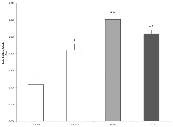 Effect of S1 and S2 on the proliferative marker cyclin D1 in HCEpiC cells. The graph shows the cyclin D1 protein levels in HCEpiC cells treated with S1 or S2 for 12 h. Data are means ± SD of triplicate. * indicates statistically significant difference from untreated control at 0 h; § indicates statistically significant difference from untreated control at 12 h (one-way ANOVA, p < 0.05).