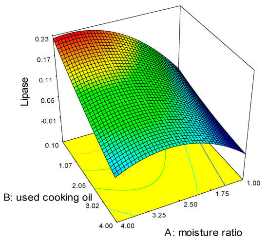 By selecting a moisture ratio of 3.0, the predicted lipase activity is calculated as 0.112 based on Equation (1). After fermentation, the lipase activity was observed to be 0.110 ± 0.00 U/gSB. The predicted and observed values were found to be similar and the model was thus validated.