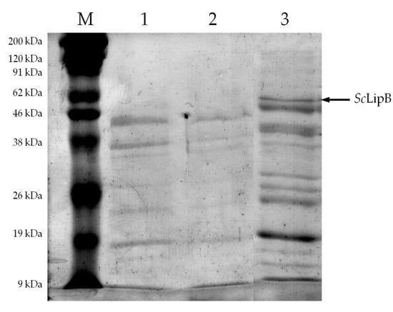 After ammonium sulfate precipitation and dialysis, it was observed that S. commune has two major protein fractions with high lipase specific activity (Table 3) which were obtained at 30% and 70% of the (NH4)2SO4 precipitation. Figure 2 shows the protein profile of S. commune lipase before and after partial purification. The 30% and 70% (NH4)2SO4 fractions were denominated as ScLipA and ScLipB, respectively. No activity was detected at 90% of (NH4)2SO4 precipitation and onwards, even though the protein contents were 3.68 mg and 73.88 mg, respectively. These results indicated that S. commune lipase did not precipitate after 80% of (NH4)2SO4 saturation. This is in agreement with the research done by Singh et al. []. They precipitated the lipase of S. commune ISTL04 up to 70% (NH4)2SO4 saturation, before further purifying it by SuperdexTM 200 gel permeation chromatography. They also found out that the protein size of S. commune lipase was 60 kDa, which coincides with Lane 3 in Figure 2. However, this protein size was not visible in Lane 2 of Figure 2. These results indicated that the partially purified fractions may contain different lipases. To further confirm this, each fraction was subjected to oil hydrolysis and glycerol esterification experiments to investigate their preference towards different substrates of various chain lengths.