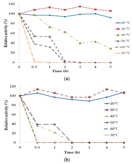 The stability and deactivation of (a) ScLIpA and (b) ScLipB after pre-incubation from 20 to 70 °C over a period of 5 h.