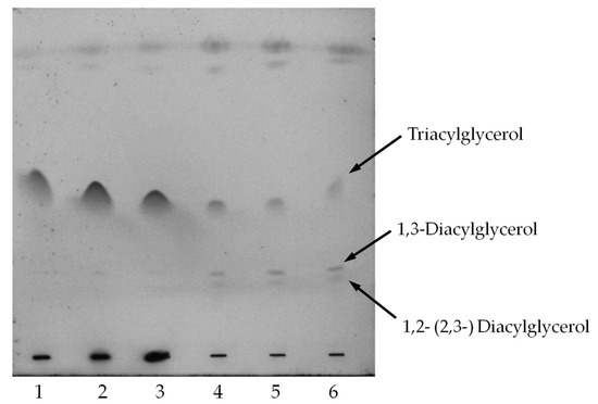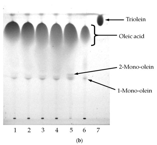 Thin layer chromatography (TLC) is a low cost reaction monitoring and an alternative method mainly used to detect chemical compounds, and it has been used for commercial characterization of oils for several decades [,,], as it is rapid and sensitive. Junior et al. [] recently studied the hydrolysis of triolein using Lipozyme RM IM from Rhizomucor miehei and the results were evaluated using TLC analysis.